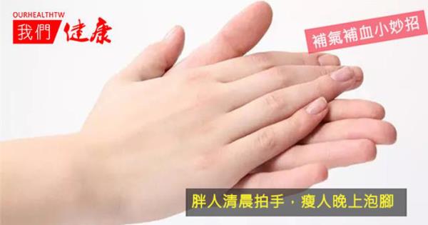 中醫認為,胖人陽氣偏虛,瘦人則陰虛火旺,針對不同體型的人呢,應該採取不同的養生方法,使得機體保持平衡狀態。 胖人補氣:清晨拍手  手是陽氣的大本營,早上旭日東昇,天地間的陽氣開始升騰,這時拍手可以振動陽氣,促進陽氣的升發,疏通全身的氣機。 方法:十指分開,手掌對手掌,手指對手指,均勻拍擊,切記拇指與其他四指分開,以免拍手過度造成淤血。開始可以輕拍,以後逐漸加重。以自己的雙手能承受為度,但不能太輕,否則起不到刺激手掌穴位和反射區的作用。 拍手最好在清晨進行,如果覺得拍手時發出的噪音太大難以接受,也可以拍“空心掌”。手掌弓起,手指張開,拍下去時,能拍到手指尖及手掌的邊緣部分,但是這種方法的打擊面縮小了,所以效果會差一些,因此拍打的時間要相對加長。 除了最基本的手掌相拍外,還可以左右掌背互拍、左右手虎口對拍等。