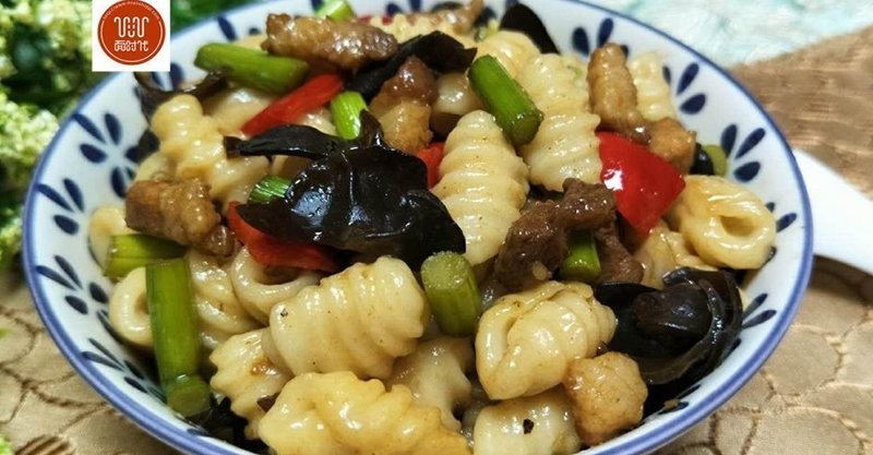 11、將煮好的貓耳朵放入冷水過一遍撈出,接著把貓耳朵也倒進去翻炒片刻加2勺生抽少量鹽,翻炒均勻,出鍋。