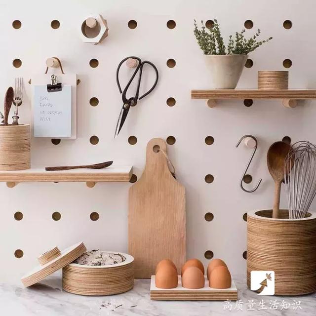 很多人已經把洞洞板運用到了自己家裡,長短隨意的橫桿,加上木板的設計,是廚房裡實用又好看的收納小能手。