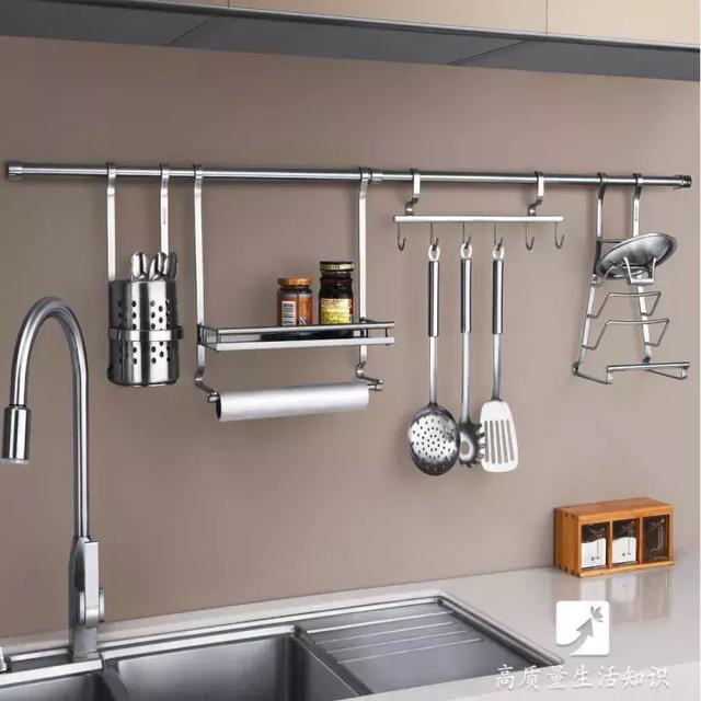 在廚房的牆壁上安裝不鏽鋼置物架,看著大氣上檔次,而且收納功能也是非常齊全的。