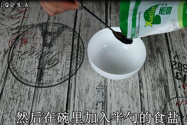 方法特別的簡單,首先我們準備一個碗,然後在碗裏加入半勺的食鹽,