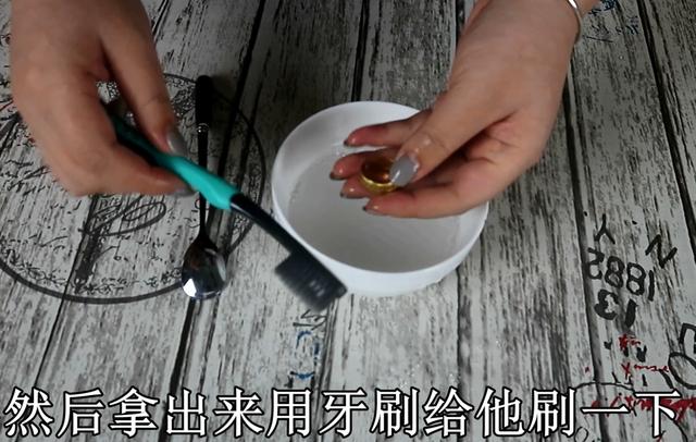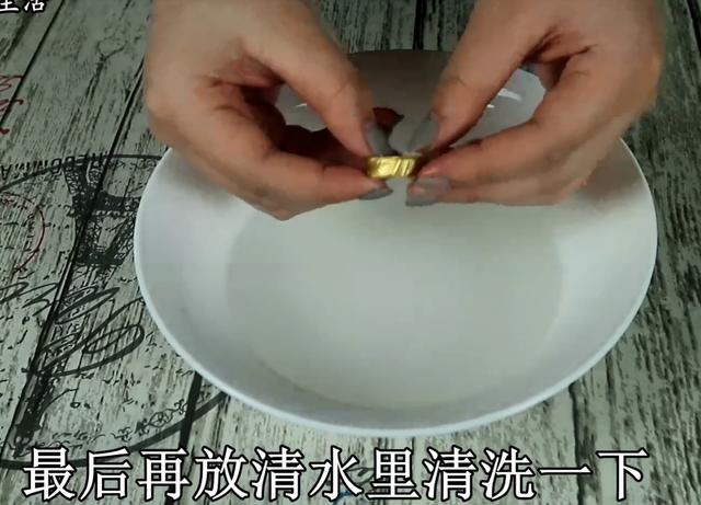 這樣金器清潔劑就調配好了,我們把要清洗的金首飾放進去浸泡一小時,(一小時後。。。。)好了我們現在再把金首飾拿出來,用牙刷給他刷一下,