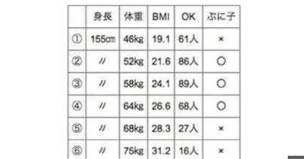 雖然緊身有緊身的性感,但這種時候男生好像比較希望女生們可以選大一號的牛仔褲穿...  看到這裡又不禁讓我覺得日本男生對胖的標準還真有點嚴格,難怪這麼多女星可以輕輕鬆鬆被歸到肉肉行列去。 而以之前雜誌CanCam做的調查,如果以身高155cm的女生來說,52公斤以上就會被日本男生認為是肉肉女,68公斤以上就直接升等小胖胖去了。  雖然如此,但這52~58公斤(身高155cm)的女生,卻是受訪男生中最多人認為OK的體型喔~ 其實只要健康其實肉多點也無妨,但胖去不健康那邊的話就真的不太OK囉!不知道大家的分界又在哪裡呢?分享一下吧!