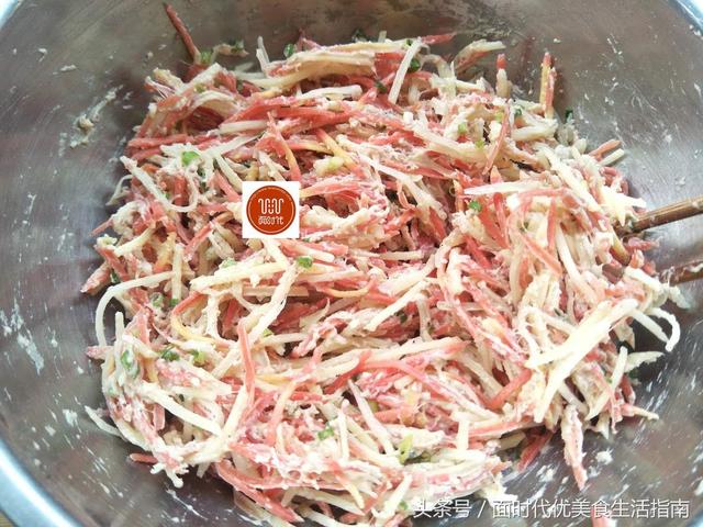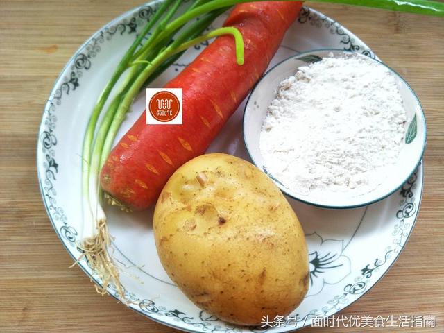 食材:土豆1個、胡蘿蔔1根、麵粉適量、香蔥3根、鹽半勺、胡椒粉半勺。