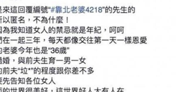 #靠北老婆4240: 我是來這回覆編號“#靠北老婆4218”的先生的 之所以匿名,不為什麼! 就因為我知道女人的禁忌就是年紀,嗬嗬 我們在一起三年,每天都像交往第一天一樣恩愛 我的老婆今年也是“36歲” 離過婚,與前夫生育一男一女 他的前夫“垃*”的程度跟你差不多 我要先告知各位女人 外面的世界很美好,這世界好人大有人在 妳可以選擇妳要的幸福跟生活。 我老婆前夫也是外遇~ 換過的小三人數大概是一個籃球隊~ 讓老婆去借錢給小三花 然後留了一屁股債拍拍屁股就走了 被家暴過,軟禁過。 追求她的時候我就知道這些 但我沒介意,負債我可以負擔的來 至於陰影,在跟我在一起後漸漸沒了。 我老婆非常有魅力,而且就像多正在綻放的花一樣美 追求她時同時也很多人在追她 追她的什麼大老闆有頭有臉的都有 她因為前夫所以很沒安全感,也無時無刻查勤,檢查手機 我不覺得丟臉沒面子,挺幸福的 我把所有的時間都留給我的老婆 工作穩定後我的薪水除了留點吃飯錢外全數都是給我老婆的 你說的名車是? 我車是賓士但在我眼裡它還不是名車,只是普通轎車 你說的名牌是? LV還是哭G? 這些在我眼裡就是普通的包包 我們住的地方市值1300萬 在我眼裡它還不是豪宅只是一般透天 我一天工作14個小時起跳 回家我也會幫忙洗衣拖地整理家務 至於小孩,她已經有一男一女了 我們相處的也很愉快 她也不是母豬,捨不得她受疼在生了 我們性生活非常愉快 至於鬆?應該跟男人的大小有關係 口技?很好但我不在意 我只在意性愛裡他是否真的快樂 我說女人多美就知道她的男人多愛她 如果你的豪絞嘴能花在實際點的地方 我想你也不會成天嫌棄你的老太婆 也不會只能找小妹妹才知道什麼是緊了 畢竟也許現在的社會什麼沒人 哪天小妹妹說不定會問你“進去了嗎?” 也許哪天你翹了你的嘴都還能噴屎 我真替你老婆感到可憐 對了!我們是姐弟戀,小弟我30還不到呢~ 相處完全沒問題 而且你老了不舉,動不了時,我還是精力充沛呢~ 對了!如果你看不過去想辯論歡迎在下面留言,我會去跟你相認的。