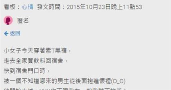說真得趕快導正他這奇怪的愛情觀啊! 還是其實這男生也是set好的, 那也真的太猛了! ------------------------------------------------------------------- 在宿舍外面被陌生人告白⋯⋯ 看板:心情 發文時間:2015年10月23日晚上11點53 小女子今天穿著素T黑褲, 走去全家買飲料回宿舍, 快到宿舍門口時, 被一個不知道哪來的男生從後面抱進懷裡(O_O) 他開始大喊:XXX你不跟我在一起我就不放手! 我:⋯⋯⋯呃可是我不是XXX⋯⋯ 大概隔了3秒 他馬上跳開然後瘋狂道歉, 臉超紅超不好意思一直跟我說因為背影超像而且我跟他說的XXX住同一棟 我覺得他的表情太有趣了, 所以就反射性的笑著對他說: 「哈哈如果我是XXX我一定會跟你在一起的!」 。 。 。 。 結果換我自己臉紅了(O_O) 他居然放聲大笑然後開始跟我說其實他知道XXX有喜歡的人了,他只是想要試試看, 然後我就開始幫他想辦法⋯⋯ 就這樣聊了1個多小時還把臉書給他了⋯⋯⋯ 真的是很奇妙的一件事( ´ ▽ ` )ノ 朋友GET!(●°u°●) 」