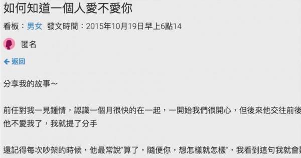 Dcard 原文:如何知道一個人愛不愛你 分享我的故事~ 前任對我一見鍾情,認識一個月很快的在一起,一開始我們很開心,但後來他交往前後差異太大等等因素,最後花的時間心思越來越少,我覺得他不愛我了,我就提了分手 還記得每次吵架的時候,他最常說“算了,隨便你,想怎樣就怎樣”,我看到這句我就會難過,給過的承諾他常常讓我失望,吵架的時候,後來也懶得安慰我,要我好好思考我值得更好的,就這樣我離開了他 幾個月後我遇到了一個男生,我常常在想,怎麼樣才能知道一個男生愛不愛我,我以前以為花時間金錢心思是愛,沒錯那是愛,但是一般的愛,這個男生追求的時候,帶我去很貴約會地方,儘管他忙碌每天睡不飽還是陪我,他試著讓我瞭解他的朋友家人,希望我多瞭解他,我們彼此有好感,但有了前任太快在一起的經驗,我還想再多觀察,還沒交往我們不知不覺牽手了,我覺得很幸福,回到當初與前任相愛的感覺,我們漫步在街上,說著聖誕節跨年要去哪裡,下次約會去哪裡,我以為我遇到下一個幸福了… 但就在一次小吵架後,他說了對不起後已讀不見了,我才知道原來我們之間的待萌芽的感情那麼薄弱,相愛的時候很容易,一頓美味晚餐,一句甜言蜜語,一個浪漫的約會地方,遇到吵架的時候,需要退讓、忍讓、道歉、磨合,我才知道看一個人愛不愛妳,不是看他平常對妳有多好,而是看吵架時他怎麼對妳,在生氣的時候,會不會想到對方感受,會不會留下陪你吵架 從前任到曖昧對象,吵架遇到需要磨合的時候都選擇逃避,留我一個人哭泣,或是說著傷人的話,我才知道他們對我的愛好薄弱,經不起吵架的溝通,真正的愛,是在生氣吵架的時候,不離不棄還會替對方著想,害怕自己講的氣話會傷了對方~ 感謝那些傷害我讓我越來越懂愛,曾經真心愛過的人,一路來我一直努力學習什麼是愛,也等待值得愛的那個人,只是一直都不順利,但時間終究會證明一切,留下來遇到困難一直不離開的那個人才是真愛,所以我應學習多愛自己充實自己慢慢等待~