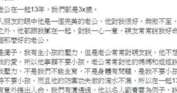 我和老公在一起13年,我們都是3x歲。 在親人朋友的眼中他是一個完美的老公,他對我很好,無微不至,除了上班之外,他都跟我膩在一起,對我一心一意,親友常常說我好命,找到一個那麼好的老公。 老公是獨子,我有生小孩的壓力,但是老公常常對親友說,他不想小孩分薄我的愛,所以他寧願不要小孩。老公常常對他的媽媽和姐姐說不要再給我壓力,不是我們不能生育,不是身體有問題,是我不要小孩。老公堅持不要小孩,而且他的防禦功夫做的滴水不漏,所以在一起13年了都沒有意外搞出人命。我們有溝通過,他以名人劉青雲為例子,說服我不生育。 我覺得我很幸福,有個很愛很愛很愛我的老公。  但是最近我從天堂掉到地獄,老公跟我坦白,他其實是男身女心,他從小到大都期望當一個真正的女人,他想要為自己而活,他要做自己,因為他已經為別人活了半輩子,他要自私一次,他要去變性,希望我能原諒他,成全他,支持他,希望我們以後能當姐妹。