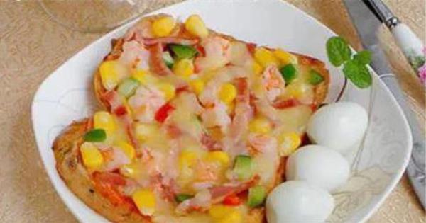 (切下來的邊直接吃掉吧) 3、在吐司片上蓋上一片火腿、乳酪。 4、再夾上一片火腿,蓋上另一片吐司。(依次順序為火腿、乳酪、火腿)  5、準備2個雞蛋打散成蛋液。(裝蛋液的碗要大一點,因為面包要放進去蘸蛋液) 6、將吐司放進碗裡雙面蘸上蛋液,輕輕蘸滿即可。 7、平底鍋倒油燒熱,放入吐司片用小火煎。 8、煎至雙面金黃色,取出用紙巾吸一下多餘的油,沿對角線切開即可。  土司小披薩  原料:面包2片、鮮蝦2隻、甜玉米粒適量、培根適量、青紅椒適量、馬蘇乳酪適量 調料:番茄醬適量、披薩草適量  1.準備好面包2片。 2.準備好配料:蝦、玉米、培根、青紅甜椒和馬蘇乳酪。 3.蝦去頭去殼去蝦線,切成小丁焯熟,培根切成小條、甜玉米粒焯熟,青紅椒切成小丁。 4.在面包上抹上一層番茄醬,撒上少許披薩草。(披薩醬味道更好,我用完了,所以用了番茄醬)  5.鋪上一層乳酪絲。 6.在撒上一層各種配料,最後表面再撒上一層乳酪絲,放入預熱好的烤箱,180度烤約10分鐘即可。  土司香蕉卷  原料:香蕉2根、土司面包片4片、雞蛋1個、白芝麻適量、煉乳適量、植物油  1.香蕉去皮切成兩段。 2.面包片用刀切去四邊的皮。 3.雞蛋打散。 4.香蕉段用面包片捲起來,然後蘸上蛋液,再裹上白芝麻。 5.鍋中倒入植物油燒至5成熱,將卷好的香蕉卷放入油鍋中,炸至金黃撈出。 6.將炸好的香蕉卷放入盤中,再淋上煉乳即可。