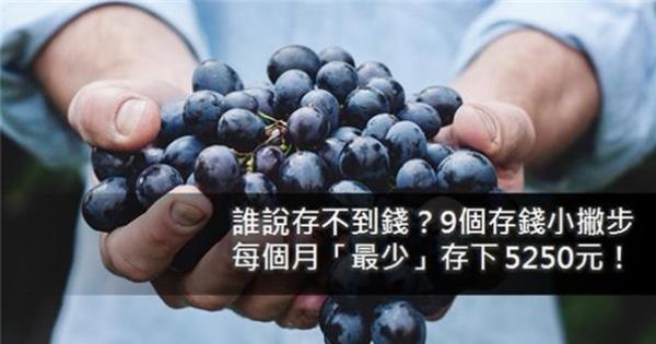 1. 準備一個存錢筒,每年最少省下 9000元 這聽起來或許是一個老招,但卻非常有用 你想想看~ 我們出去外面吃完飯回來,拿了找開的2.30塊零錢 隨手丟進去我們的小豬撲滿 1天25元,1個月750元,1年就有9000元了耶! 這足夠讓你去好好吃個大餐買個衣服犒賞一年的辛勞了吧! 等養成習慣後,金額可以慢慢放大哦!  2.集點、折價券別亂丟,一年的 咖啡錢就省下來了! 有看過電視節目的省錢折價王嗎? 這些人光是利用折價券就幫他們家省了好幾百美元! 別小看集點或者是折價券的力量 日積月累也是可以幫你省下好機杯咖啡錢呢!  3. 加薪先別花掉,存下來當作 投資基金! 賺的越多、花的越多, 是小資族存不到錢的主要原因之一! 如果在工作表現優異 並且很幸運地得到老闆的加薪 小資族,先別急著去吃大餐慶祝 把增加的薪水當作你每個月的儲蓄,存起來吧! 這筆錢就是你未來的投資理財的基金!  4.每週給自己一個挑戰,一個月再多存 1000元! 幫自己每個禮拜都設定一個存錢目標 既然是挑戰,那當然就要挑個有難度的囉 像是第一週存50元,第二週存100元、第三週存150元… 依序儲蓄下去,月底就會發現自己多存了1000 元! 當然你也可以以倒敘的方法來存:500,450,400......, 到年底你可以發現自己默默地又多了一筆小資產! 5. 將每月的存款 當成一張帳單 你每月都會收到一張又一張的帳單 而你又非得繳交這些帳單不可 那何不把你每月的存款當成一張你「必繳的帳單」呢? 這樣還怕錢存不下來嗎?  6. 善加利用你的銀行,準備另一個戶頭,當成自動儲蓄帳戶! 這是一個非常簡單的方法! 當你每個月的薪水匯進你的戶頭時 直接讓銀行幫你將固定一部分的薪水存到你的存款帳戶 讓你不能一時想要買個東西就輕易地將所有的錢都提領出來!  7. 幫自己的夢想帳戶取個名字 建立一個新帳戶,或是附屬帳戶 帳戶名取一個比「備用基金」更具體的名字吧! 像是你想買的東西「BMW M6」、計畫「歐洲背包客之旅」 這些名字有沒有讓你更有動力儲蓄了呢?  8. 戒掉那些不健康的生活習慣,每個月再省2000元! 你會抽菸嗎?少抽點或是戒掉吧! 一包香菸的平均價格大約新臺幣65元 少抽一包香菸就多了一頓吃飯的錢! 一個月就省下將近2000元了呢! 喝酒跟喝飲料也是同樣的道理~多喝開水省錢又健康! 你平常都會騎車到巷口的便利商店嗎? 散步去吧,散步每半小時可消耗熱量七十五卡 既增加心肺功能,又能改善血液循環、活動關節、助於減肥 最重要的是可以省下你的加油錢! 9.換個朋友聚會的方式,每個月省下1500元! 平常我們跟好姊妹們聚會總是喜歡在外面吃吃下午茶和甜點 這些花費隨便可能就動輒 300、500元, 一個月很容易就超過1500元,很可觀吧! 試試看在家自己準備下午茶 或是和另一半一起早起做早餐 這樣一來 我們也不用為了省錢而捨棄含朋友交流的時間 偶而換個聚會的方式也增添我們生活的樂趣!  全部做到,每個月最少存下5250元! 用存錢筒,每個月至少存下750元; 挑戰自己,每個月再存下1000元! 戒掉不良生活習慣,每個月多出2000元! 換個朋友聚會方式,每個月存下1500元! 除此之外,你還省下了咖啡錢、存到了投資的基金,很棒吧! 如果你想存快一點的話…你可以考慮 洗衣基金 自動自發,幫家人洗衣服, 並告訴家人,口袋裡發現的現金 → 歸你 : P