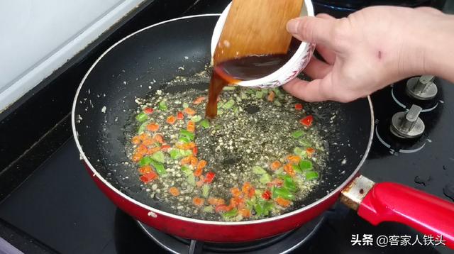 第十步:再把剛剛爆蒜蓉的油燒熱,然後加入青紅椒碎,把它爆一下,再倒入調好的汁,燒開