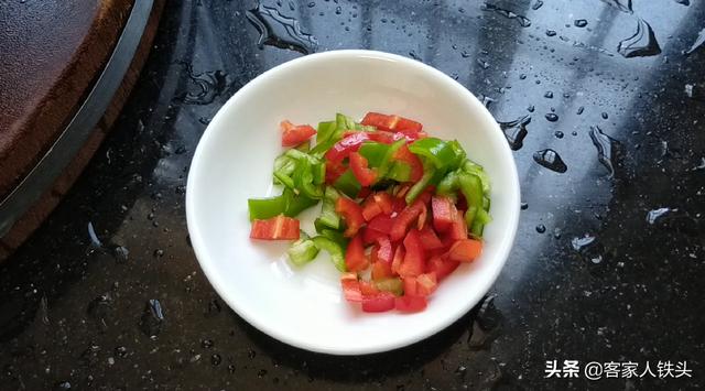 第三步:準備一些青紅椒,不吃辣的可以換成甜椒或不放,把青紅椒切粒。