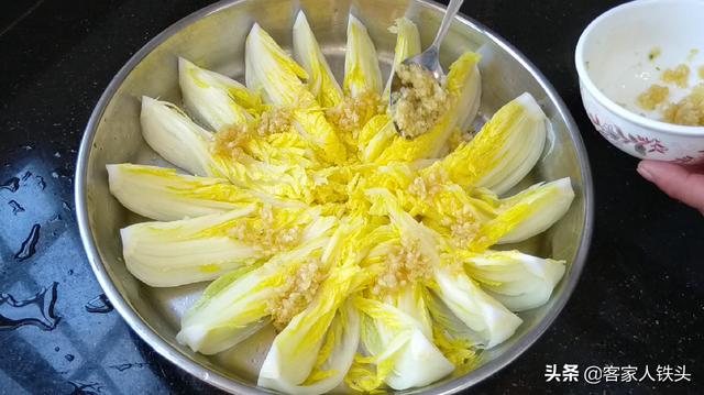 第七步:大概燙10秒鐘左右,就把白菜夾起來瀝水分,準備一個大一點的盤子,把白菜裝盤,裝好後在上麵灑一層蒜蓉,然後把晾乾水分的粉絲鋪到上麵