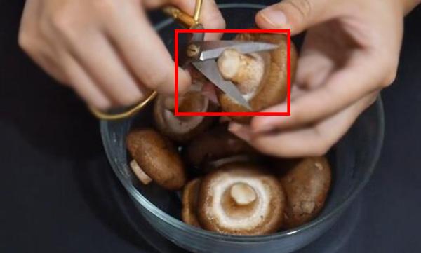 首先,我們需要將買來的香菇放入一個乾凈的容器中,接著準備一把剪刀,將每個香菇的根部剪去一部分,在使用剪刀時一定要小心。