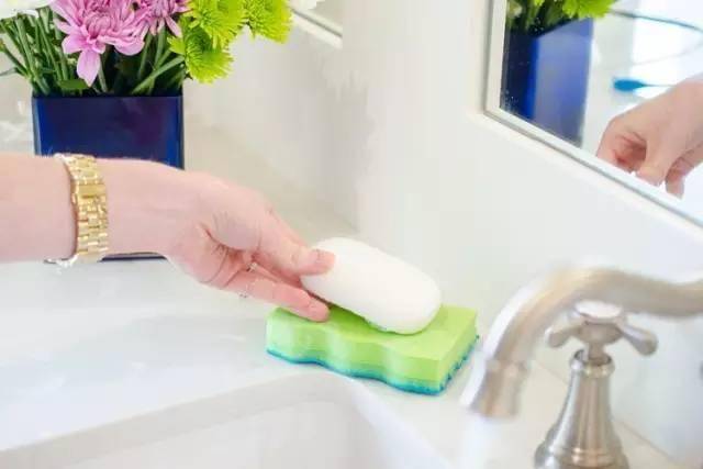 海綿墊能吸水,還不打滑,用來放肥皂,就不用再買肥皂盒啦,肥皂用完之後也不會一直濕漉漉的。