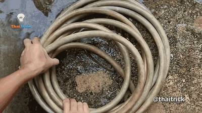 水管用久了,裡麵會長青苔。撕下一層海綿,捲成圓柱。