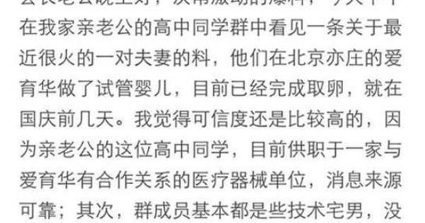 有網友爆料:娛樂圈某新婚夫婦國慶前在北京亦莊一家醫院做了試管嬰兒。但是試管嬰兒一般都是高齡夫婦的選擇,像新娘這麼年輕的女孩幾乎沒有選擇試管嬰兒的。當然,高齡這一個條件絕不是試管嬰兒的適應症。所以此夫婦選擇試管嬰兒很有可能是有其他原因。 娛樂圈中靠試管嬰兒成功孕育的不在少數。 劉德華:  早在幾年前,劉德華承認與朱麗倩結婚時就已表明,自己秘密結婚的原因就是因為需要是註冊夫妻才可以進行試管嬰兒,他也承認妻子成功受孕得益於輔助生殖技術。劉德華夫婦算是試管嬰兒成功生育的代表。 黎姿: