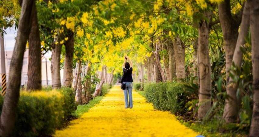 嘉義縣文觀局表示,嘉義縣山海平原一年四季都有特色主題旅遊,五到六月盛開的阿勃勒黃金雨即將登場,金色夢幻大道有如韓劇「永遠的君主」另一個世界般的美景,當風吹拂過阿勃勒,成串的金黃花朵落英繽紛,宛如「黃金雨」般灑落,如夢似幻,成為名副其實的金色大道。