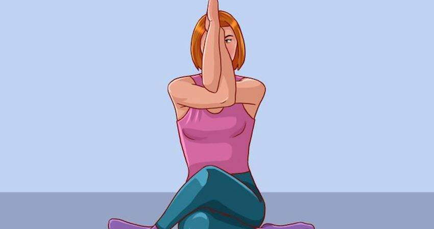 起始動作先盤腿坐穩,深吸一口氣,同時向上伸直雙臂,吐氣時向一側伸展,盡可能拉伸側腹和肋骨。如果不想雙手伸直,也可以自然交叉,互抱手肘。