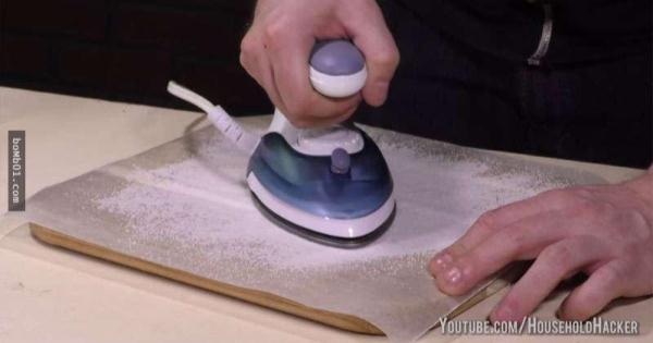 ▼1.電熨鬥使用久了上面會有一些難以去除的汙漬。取來一張烘焙紙,在上面均勻撒上食鹽,然後將電熨鬥開到最熱,在食鹽上熨燙1分鐘,面板就能光亮如新。