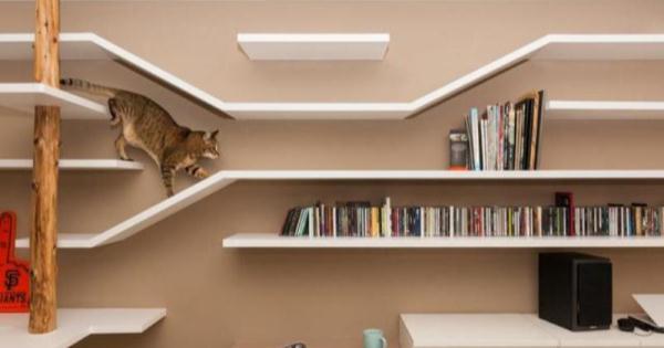 客廳的文化石電視牆,與落地采光散發舒適自然的氣息,沙發背牆一整片的拆板書牆,既可收納、展示,也是寵物貓最好的跳台與走道。