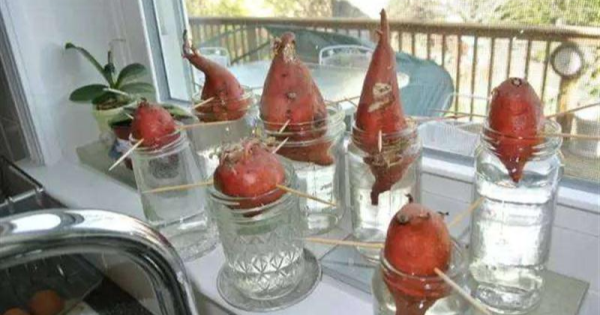 ▼按照根須的朝向,根須朝哪頭,哪頭就放在水裡。水浸泡地瓜的一部分就可以了。