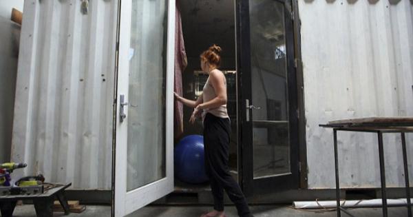 他最近在開發自動澆灌植物的係統。對於盧克來說,集裝箱的生活是剝離到基本需求的社會實驗。他希望能夠教會更多人仿效。“這裡是世上生活成本最高的地方之一。如果我們在這裡可以辦到,那世上任何地方都可以,”他說。圖為希瑟·斯圖爾特在建造她的集裝箱。