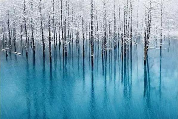 很多人到北海道美瑛賞花時,可能會順道去「白金溫泉」放鬆身心,但半路上有一個隱身樹林裡的神秘水池卻經常被錯過。因為防災工程無意形成的「白金青池」,由於含鋁的關係,一年四季都是藍色的。在不同天氣下,藍色還會有不同深淺變化唷!