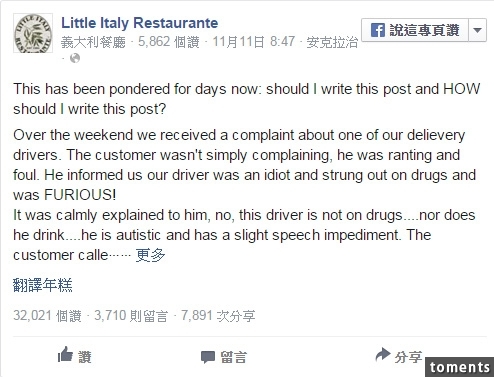 吉亞羅婆娑介紹,這名送餐員已經在餐廳工作2年了,他是勤奮工作的好員工,也是成績優秀的大學在校生。因為這名員工罹患自閉症,在工作中難免會出些問題被客人投訴,但當客人瞭解到他的情況後,所有的客人都選擇了諒解。