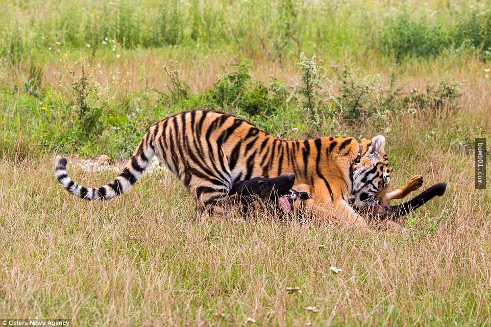 ▼老虎與德國牧羊犬偶爾也會打架,不過並不會給彼此造成傷害。