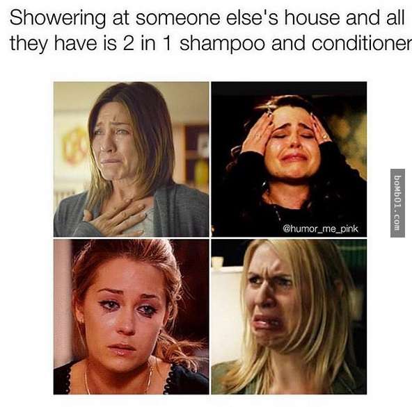 「在別人家洗澡可是他們只有2合1的洗髮精和潤髮乳。