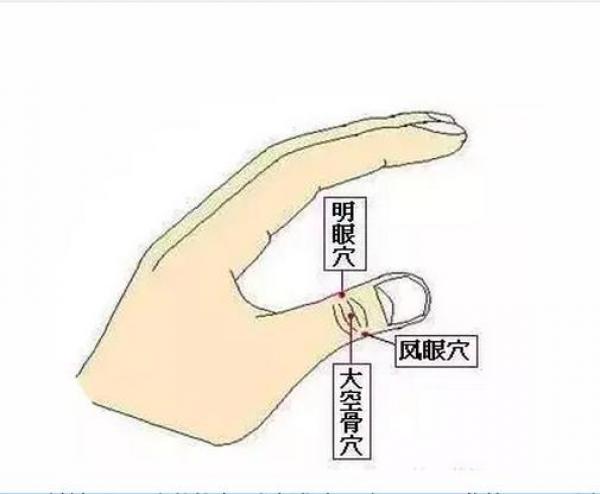 在我們的拇指上有三個相鄰接的穴道,分別是明眼、鳳眼、大空骨(如上圖)。明眼、鳳眼能夠改善眼睛疲勞和急性結膜炎,大空骨則可改善一切有關眼睛的症狀。平時眼睛容易疲勞的人,每天要刺激這三個穴道兩次。
