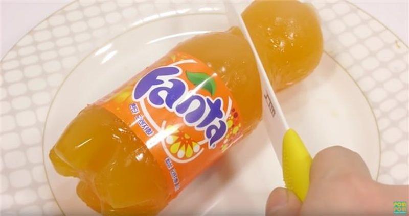 將汽水與明膠混合物加熱攪拌均勻,去除泡沫後再倒進汽水瓶中,放入冰箱,等凝固後再從冰箱取出。