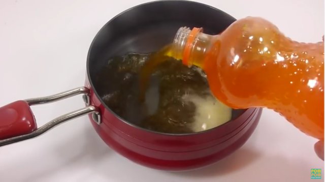 將汽水倒進平底鍋中,再加入明膠(吉利丁),攪拌均勻!