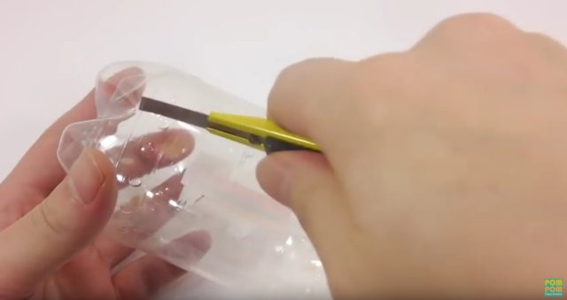 取下瓶身的標籤,用美工刀在瓶身切一道口子。
