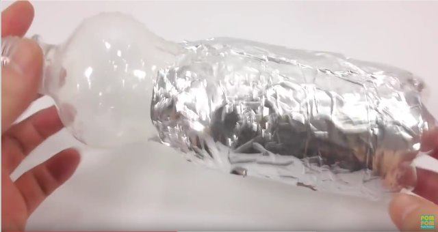 用鋁箔紙將汽水瓶身裹緊,以防止液體從切開的口子處漏出來。