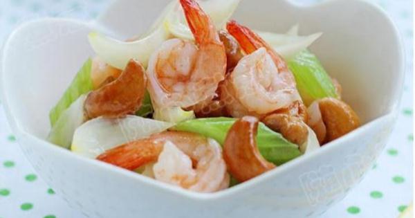 4.鍋中倒入油燒熱,放入腰果炸至金黃色後撈出,再放入蝦仁輕輕滑散,至蝦仁捲曲熟透後撈出
