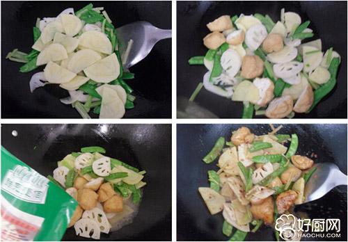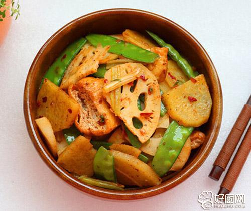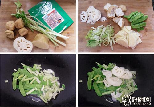 食材:蓮藕100克 土豆100克 荷蘭豆100克 芹菜1根 油適量 鹽2克 麻辣香鍋調料10克 清水少許 雞粉少許 豆腐泡4個。 做法: