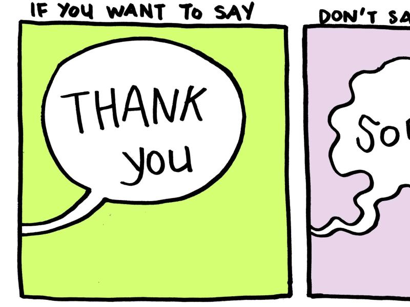 當我們還小的時候,師長與父母都要我們常常把「請」、「謝謝」、「對不起」掛在嘴邊以示對別人的禮貌。但你有沒有發現到現在的人們常常把「對不起」掛在嘴邊?事實上有大多數的人們在表達自身的心意上,為了避免尷尬的場景常以迂迴的話術來表達內心感受。原本的意思除了變得扭曲外,也讓聽的人不甚高興。或許我們應該學習著如何誠實表達內心的感謝話語而不是再以負面的話回應著。 下次當你要說「對不起」時,不妨以「謝謝」來表達。底下是由一名來自紐約的中國藝術家Yao Xiao所畫的漫畫,裡頭生動的向人們表示說「謝謝」會更好! 當你想說「謝謝」的時候,就不要說「對不起」!  1、跟人相約遲到時,應該跟對方說:謝謝你的耐心等候。