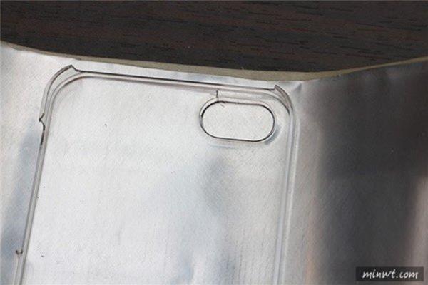 Step6 利用紙膠帶將它貼平。  Step7 接著再貼上卡典西德。  Step8 由於鋁是平滑的,因此不會像之前出現氣泡。  Step9 當貼上顆粒面後,質感變更好了。  Step11 將它剪掉後,再慢慢修個邊。  Step12 接著將手機殼放到鋁片上,並將相機的開孔出,用簽字筆標記一下。