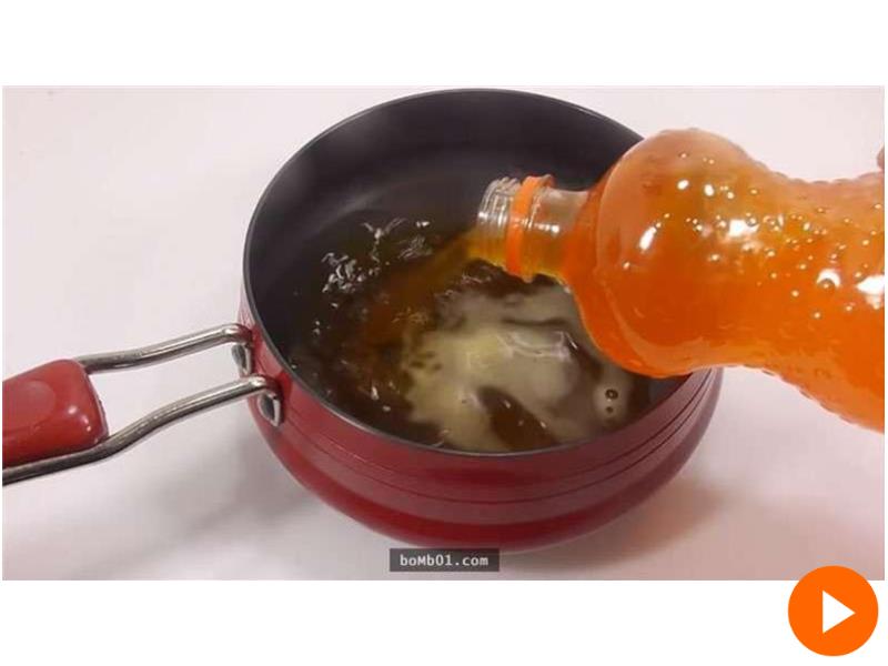 ▼將汽水與明膠混合物加熱,攪拌均勻,去掉泡沫,然後倒入汽水瓶中。  ▼將汽水瓶放進冰箱中,待混合物凝固再取出。去掉汽水瓶,完美的芬達果凍就出現了。   ▼這就是製作過程。 朋友聚會時,將這樣的甜點擺上桌,一定會收獲很多讚美。