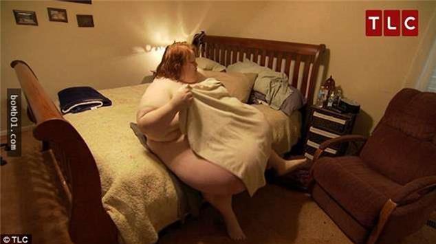 她說食物對她很有吸引力,雖然知道吃這些會要了自己的命,但還是無法抑製進食的慾望,每天睜開眼就想吃東西。 ▼洗澡後她坐在床上擦乾,並塗抹乳液。
