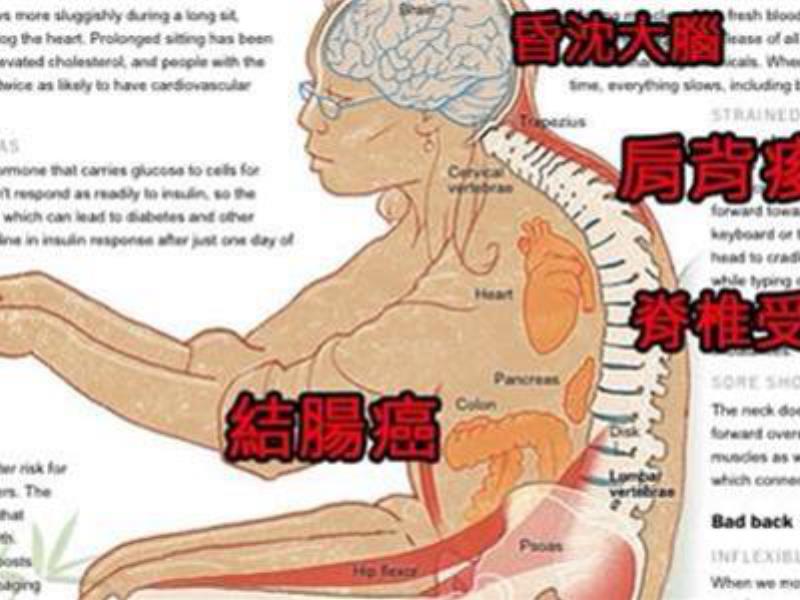 6.會使男性提前進入更年期: 久坐不動的男性因缺乏鍛鍊,容易出現腹型肥胖;久坐不動,還會產生心理壓抑、無精打采、倦怠無力。總是「黏」在椅子上的男性腦力勞動者會比其他男性更早步入更年期。  7.易得前列腺炎: 久坐時,人體上半身的重量全壓在下半身,容易導致前列腺血液循環不好,代謝產物堆積,使得前列腺液排泄不暢,造成前列腺慢性充血,進而引發前列腺炎。 8.易發胖: 久坐不動,肌體將攝入的脂類、澱粉過多地轉變為脂肪貯存起來,致人肥胖。  9.會引起頸椎僵硬: 久坐會影響頸動脈對頭部的供血,還破壞了正常生理彎曲,容易出現弓背或骨質增生。  10.易發生肌肉痙攣: 久坐使血流不暢,肌肉僵硬、痠痛、萎縮,使肌肉失去力量和彈性而發生痙攣。 11.會引起腰背疼痛: 久坐使得整個軀體重量全部壓在腰骶部,使腰背肌長期處於緊張狀態。  12.女性久坐更易得3種癌: 研究發現,久坐對女性的傷害遠高於男性,它容易導致女性患癌,特別是乳腺癌、卵巢癌、多發性骨髓瘤的風險上升。