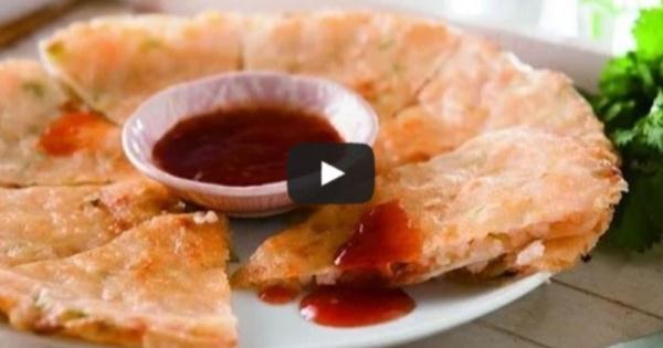 4. 熱油鍋至約120℃,放入作好的蝦餅,以小火慢炸並以筷子輕輕翻面,炸約4分鐘至表面呈金黃色即可取出瀝幹油,切成小片。
