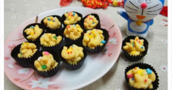 取一張紫菜鋪在薄餅皮上,再刷上一層蛋白。 將另一張薄餅皮鋪在紫菜上。 用剪刀將薄餅皮剪成小片,在中間剪一小縫,將一端穿過,拉直,即可。 用中小火炸至開始變金黃色,立刻取出,待涼。 待紫菜脆餅完全涼了,才裝 花生餅 Peanut Cookies