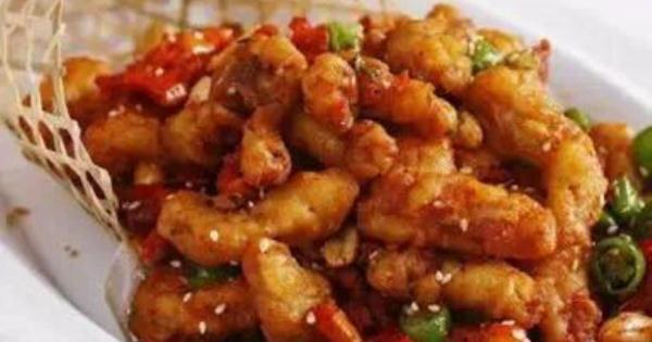 豬裡脊肉250克、澱粉100克、食鹽11克、蔥5克、薑5克、花椒10克、料酒1小勺、白糖1克、辣椒粉5克、白芝麻1小勺、植物油300克、水適量