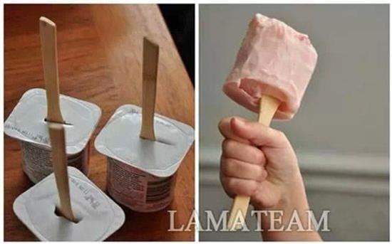將冰棍棍放在酸奶罐裡,冰箱裡冷凍,為寶寶製作出有史以來最容易製作的甜點。
