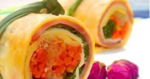 3、蛋餅上鋪上奶酪片,培根片、胡蘿卜絲、韭菜、金針菇卷成卷。