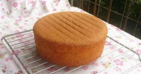 10、把拌好的蛋糊倒入八寸蛋糕模中,輕磕幾下震去面糊中的大氣泡,表面用刮刀稍抹平,送人預熱好上下火130度的烤箱下層烤25分鐘後,轉上下火165度再烤25分鐘,出爐輕摔一下然後倒扣在烤網上晾至完全冷卻方可脫模