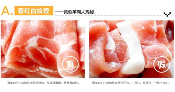 假羊肉的肥肉和瘦肉是分開的,真羊肉的肥肉和瘦肉相連且紋路清晰。把羊肉片化凍”,化凍後,問題羊肉肉色鮮亮,紅肉和白肉輕輕一碰就分開了,而真羊肉即使用手撕,紅白肉都是相連的。